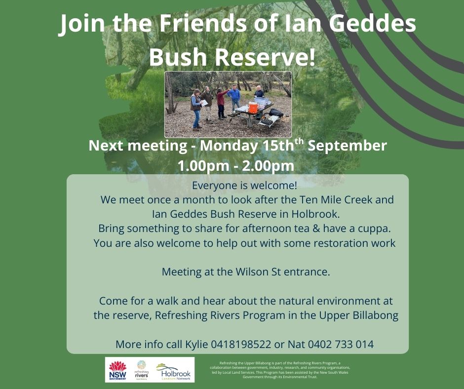 Friends of Ian Geddes Reserve Meet also Working bee – bring secateurs and/or loppers + Add to Google Calendar + iCal / Outlook export Date Nov 09 2025 Time 10:00 am - 12:00 pm Location Holbrook, Ian Geddes Reserve Category Biodiversity Community Creeks
