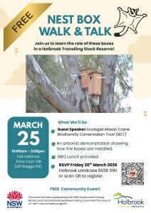 We’ll be joined by expert ecologist Mason Crane, who will explain the vital role these nest boxes play in our Travelling Stock Reserves. Whether you’re a nature lover or just curious about the local landscape, it’s going to be a great day out.