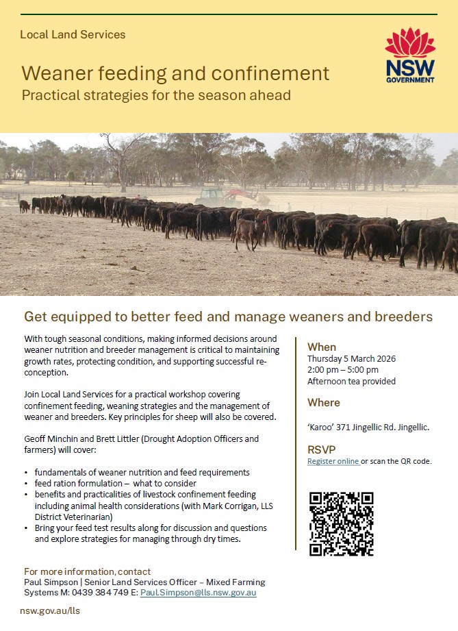 Weaner feeding and confinement + Add to Google Calendar + iCal / Outlook export Date Mar 05 2026 Time 2:00 pm - 5:00 pm More Info Register Here Location 'Karoo' 371 Jingellic Rd, Jingellic Organizer Local Land Services Register Here