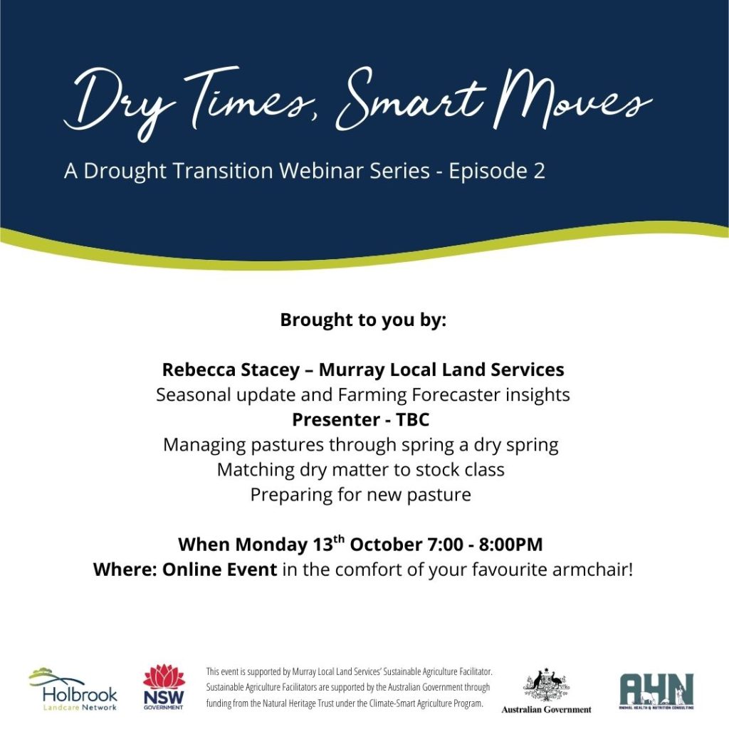 There are 3 webinars organised for Monday 8th September, 13th October and 10th November with different guest speakers. The first webinar will hear from guest speaker Dr Jillian Kelly from Animal Health & Nutrition Consulting. Rebecca Stacey from Murray LLS will also provide a Farming Forecaster and seasonal update. Murray LLS District Vet Mark Corrigan […]