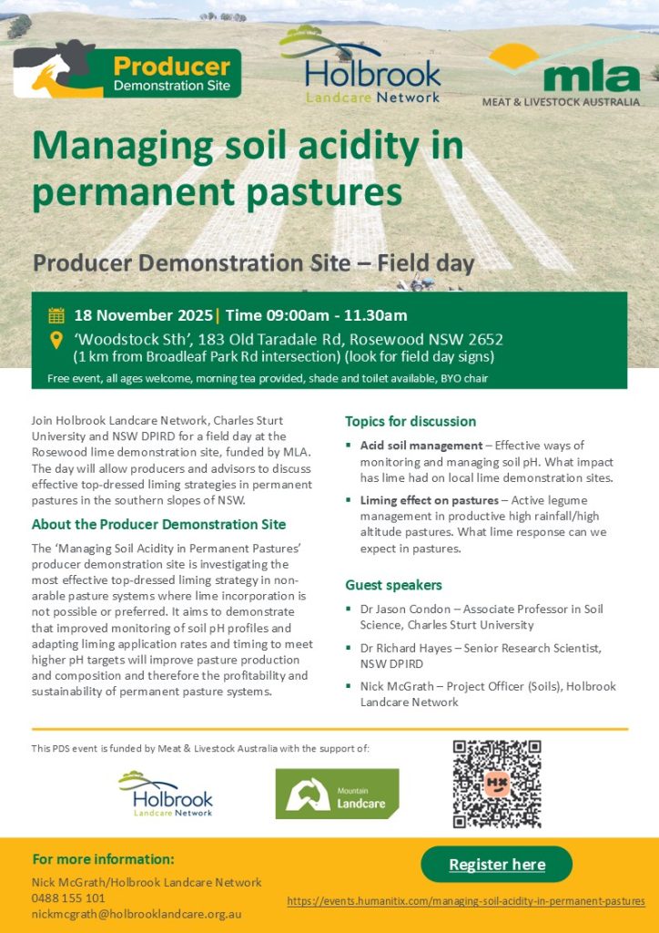 Join Holbrook Landcare Network, Charles Sturt University and NSW DPIRD for a field day at the Rosewood lime demonstration site. The day will allow producers and advisors to discuss effective top-dressed liming strategies in permanent pastures in the southern slopes of NSW. About the Producer Demonstration Site The ‘Managing Soil Acidity in Permanent Pastures’ producer […]